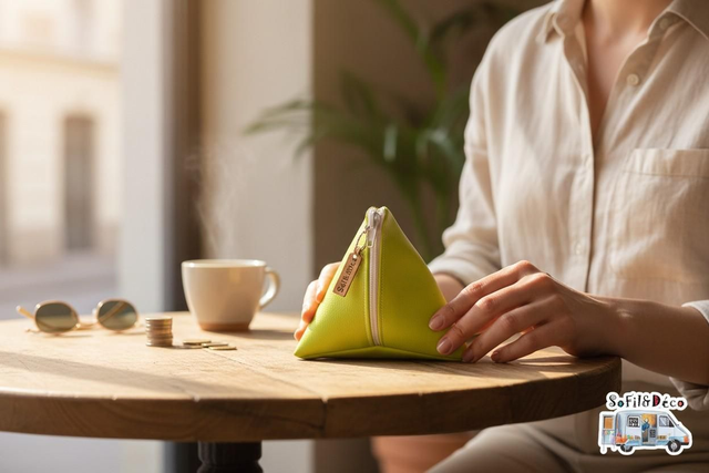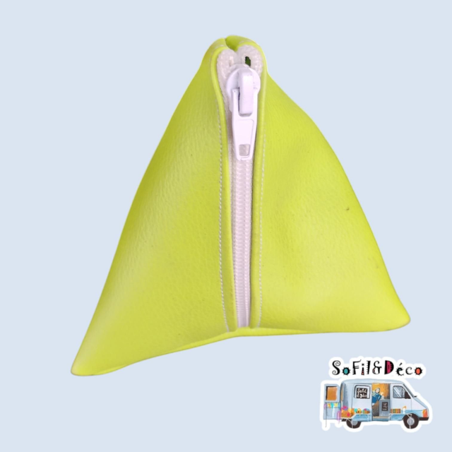 Trousse en simili cuir coloré, inspirée du berlingot, avec sa forme pyramide unique. Compacte et pratique, elle accueille pièces, bijoux ou petits objets.